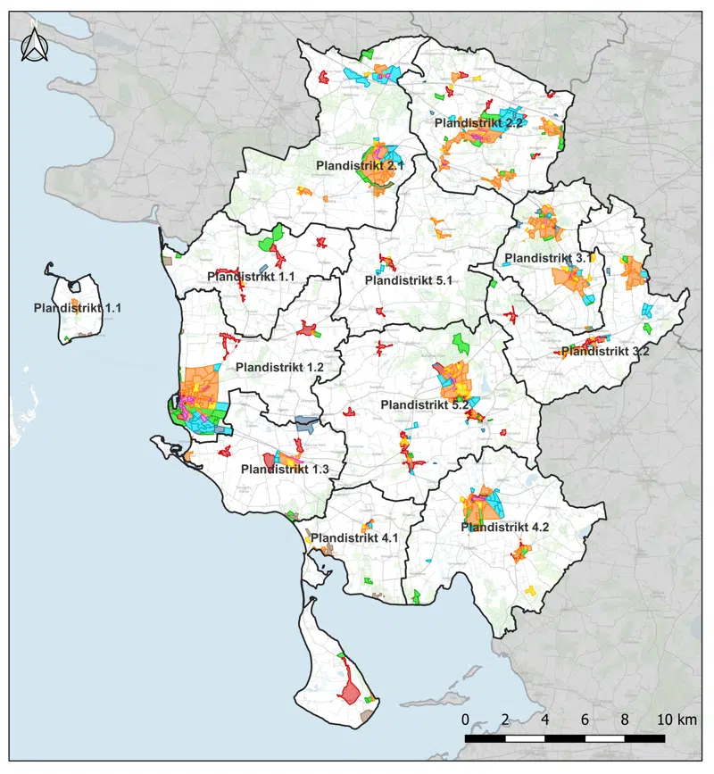Plandistrikt: Kommunen er opdelt i 5 distrikter, der igen er underopdelt i 2-3 underdistrikter. Se kortet med plandistrikter og delområder. Plandistriktet kan aflæses med de første to tal i rammenummeret.